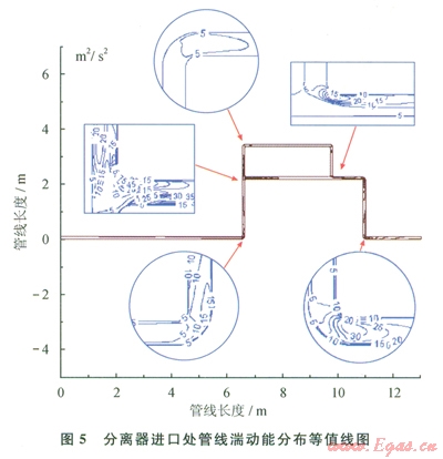 由于結構的變化,彎頭迎著來流方向的內(nèi)弧面首先承受流體的沖刷,且流體速度達到最大,表明該位置的沖刷破壞危險性較高。與此同時,彎頭迎流側中上部位置形成局部湍流,湍流強度有明顯增強,湍流動能數(shù)在彎頭區(qū)域處達到最大值75m2/s2(圖5)。由于流體的慣性作用,流體沿著彎頭的弧度向前流動,正對著來流方向的彎頭外弧面上方的直管段位置,也承受了較大的沖刷作用;T形管內(nèi)最大流速發(fā)生在來流支管主流區(qū)域和與主流管道垂直的支管道內(nèi)遠離主流一側的區(qū)域,而與主流方向一樣的另一條支管道內(nèi)的流速則相對平緩。同時,渦流程度也在垂直主管道的支管道中靠近主流的一側以及支管道與主管道銜接部位的拐角處有了較大提高,湍流動能數(shù)也達到了該管線的峰值。