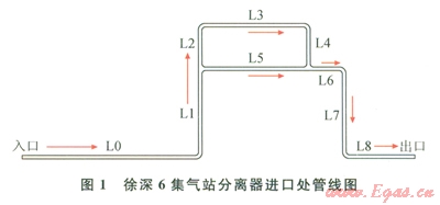 工況以大慶油田徐深6集氣站為例(圖1),管道材質(zhì)為20G,管徑為89mm,運行壓力15.1MPa,溫度55℃,氣相中含水率為0.001336%。管線各段長度見表l。