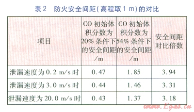 FLUENT軟件雖具有很高的權(quán)威性,但該空間模型還較簡(jiǎn)單。危害氣體源僅考慮CO,忽略其他氣體(如H2)的影響??赏ㄟ^理論擴(kuò)散計(jì)算對(duì)微量泄漏工況進(jìn)行驗(yàn)證(無初速度和重力影響)。理論擴(kuò)散計(jì)算得知,對(duì)微量泄漏,2m高程處,C0體積分?jǐn)?shù)達(dá)到0.02%時(shí)7C0初始體積分?jǐn)?shù)為54%的安全間距是初始體積分?jǐn)?shù)為20%的安全間距的1.64倍,該值與其2m高程時(shí)的模擬安全間距對(duì)比倍數(shù)l.65極為接近,故可充分表明軟件模擬的置信性。