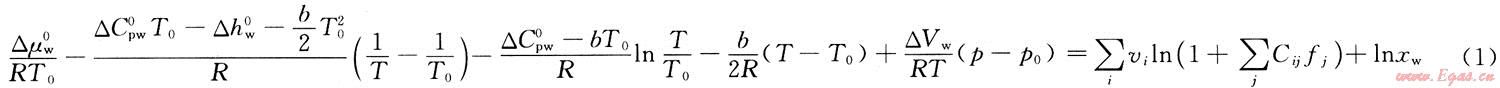 式中:△Cpw0、△hw0為T0時β相與純水相的焓差、熱容差;△μw0為標(biāo)況時完全空的天然氣水合物結(jié)晶晶格(β相)與水的化學(xué)位偏差;b為表示熱容的溫度系數(shù);μβ為完全空的天然氣水合物晶格中水的化學(xué)位;△Vw為β相和w相(富水相)間的摩爾焓差和體積差;vi為i型空腔的百分?jǐn)?shù);Cij為組分對型空腔的Langmiur常數(shù);fj為混合氣體中組分的逸度,Pa;xw為富水相中水的摩爾分?jǐn)?shù)。