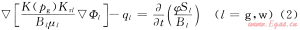 在滲流力學基礎(chǔ)上,從推廣的達西定律和黑油模型出發(fā)建立了三維氣、水兩相流考慮應(yīng)力敏感的非線性滲流數(shù)學模型[3~4],即