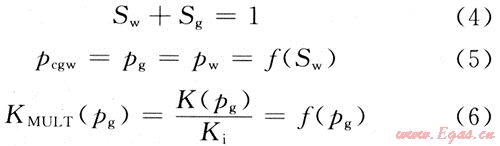 (2)中包含了4個基本變量:pg、pw、Sg、Sw。為了完整地描述方程,還需3個附加的輔助關(guān)系式: