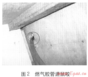 2010年11月5日,溫州市區(qū)康泰大廈一住戶廚房內(nèi)發(fā)生一起燃?xì)獗ㄊ鹿?,造?人受傷、2戶建筑受損,爆炸原因系老鼠咬破膠管引發(fā)燃?xì)庑孤Dz管被鼠咬是用戶家中安全用氣的最大隱患之一,每年冬春兩季鼠患最為嚴(yán)重。統(tǒng)計數(shù)據(jù)顯示,2009年公司供氣區(qū)域內(nèi)發(fā)生230起有關(guān)膠管隱患處警,其中膠管被鼠咬有76起;2010年共發(fā)生有關(guān)膠管隱患處警200起,其中膠管被鼠咬有93起,進(jìn)而發(fā)生爆燃的有5起。通常用戶家里所使用的燃?xì)饽z管為橡膠軟管,易被鼠咬(見圖2),用戶在不知道的情況下開啟灶具開關(guān)就會產(chǎn)生爆炸、爆燃等事故。