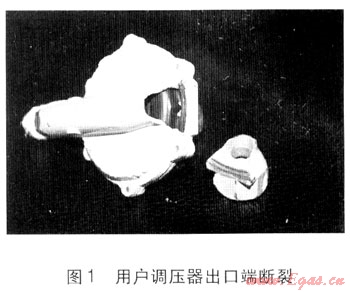 調(diào)壓器本體泄漏,包括本體進(jìn)出口端開裂、斷裂(見圖1)、閥蓋破裂、本體與螺紋接頭處泄漏等。調(diào)壓器本體所用材質(zhì)主要是生鋁,韌性不足,閥體厚度(約2mm左右)不足,制造工藝缺陷造成調(diào)壓器本身質(zhì)量問題;其次,本體與螺紋接頭采用金屬膠粘合連接,其強(qiáng)度較低,如果安裝人員沒有正確安裝操作,會導(dǎo)致粘合部位受損或嚴(yán)密性達(dá)不到要求;再次,由于采用硬連接,隨環(huán)境溫度變化和建筑物沉降,調(diào)壓器連接處發(fā)生伸縮彎曲而受應(yīng)力作用,從而造成泄漏。