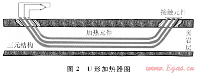 不同于Y形加熱器的位列方向,U形加熱器將3個(gè)加熱器在地面上以三角形方式水平排列(圖2)。該加熱器利用了較長(zhǎng)的、大體上水平的加熱器支腿長(zhǎng)度,可用來(lái)開采較薄層的油頁(yè)巖礦層,缺點(diǎn)是鉆多個(gè)水平井和斜向井,成本較高,不容易實(shí)施。