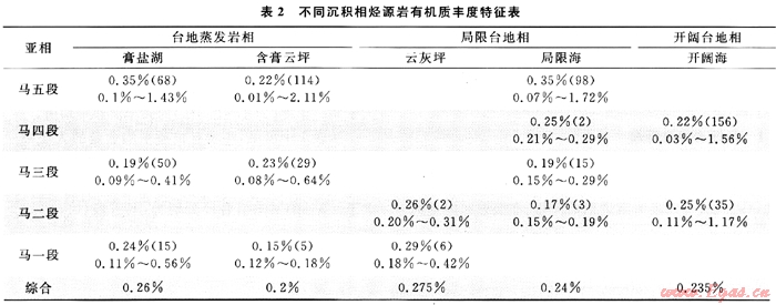 從中可見:馬五段膏鹽湖和局限海有機質(zhì)豐度最高,均為0.35%;而含膏云坪微相較低,僅為0.22%;在馬四段,沉積環(huán)境差異導致有機質(zhì)豐度不同的現(xiàn)象較明顯,局限海有機質(zhì)豐度明顯比開闊海高,兩者分別為0.25%和0.22%;馬三段盡管形成于水體相對封閉的環(huán)境,但是各微相有機質(zhì)豐度均很低;馬二段與馬四段類似,即局限臺地比開闊臺地有機質(zhì)豐度略高,云灰坪有機碳含量為0.26%,開闊海為0.25%;馬一段云灰坪和膏鹽湖有機碳含量較高,分別為0.29%和0.24%。