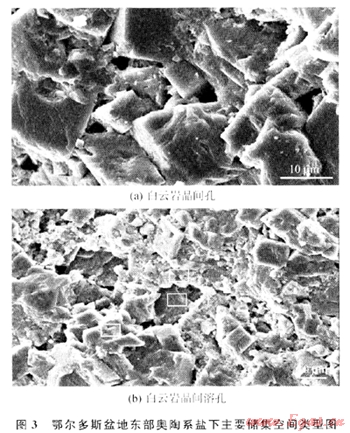 盆地東部下奧陶統(tǒng)馬家溝組發(fā)育大面積的厚層膏鹽巖。盡管奧陶系碳酸鹽巖烴源巖有機質(zhì)豐度較低。但是母質(zhì)類型好、熱演化程度高[4],況且賦存有大量瀝青、見有機包裹體[5~6],所以是有效的氣源巖。奧陶系鹽下主要為白云巖儲層,儲集空間以晶間孔、晶間溶孔、膏鹽晶模孔、針狀溶孔、斑狀溶孔為主,并有成巖縫、構(gòu)造縫、巖溶縫伴生嘲。對鹽下烴源巖質(zhì)量、儲層發(fā)育特征和源儲配置關(guān)系的研究,是確定該區(qū)天然氣成藏潛力的重要依據(jù)。