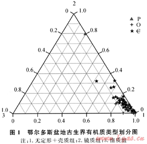 根據(jù)有機質(zhì)顯微組分特征可以確定有機質(zhì)的類型。這種方法確定的類型偏重于對有機質(zhì)來源的判斷。筆者將顯微組分劃分為3部分:無定形+殼質(zhì)組;鏡質(zhì)組;惰質(zhì)組。其中在寒武系和奧陶系無定形組分的含量均大于80%。以這3部分為端元,作出劃分有機質(zhì)類型的三角圖(圖1)。