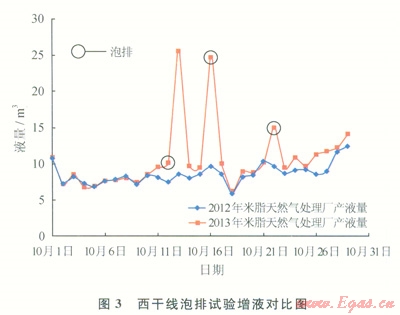 整理子洲氣田天然氣處理廠2012和2013年1—10月西干線產(chǎn)液數(shù)據(jù)進行對比分析(圖3),泡排措施之前下游天然氣處理廠液量變化較小,增液指標(biāo)在較小幅度內(nèi)正常波動,在泡排期產(chǎn)液量均有所增加,部分時段泡排后立即見效,部分時間發(fā)生在泡排后的1~2天內(nèi),分析認為與泡排區(qū)段內(nèi)管線的氣量波動、積液狀況等相關(guān)。