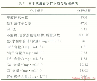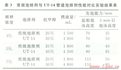 目前國內(nèi)外所使用的泡沫劑為了減少礦化度、溫度對其排液效果的影響,基本上采用陰離子表面活性劑[17],由于西干線管線積液(表2)中有大量的甲醇和凝析油,其為擴散能力很強的低分子量物質(zhì),它的存在將加快泡排劑泡沫表面的排液速度,使得泡排劑產(chǎn)生的泡沫極不穩(wěn)定,很容易破滅。為此,對管線泡沫排水劑配方研究從以下兩方面進行:①為了消除甲醇對發(fā)泡劑泡沫穩(wěn)定性的影響,對活性劑進行篩選,選用泡沫壁相對較厚且泡沫形狀呈菱形穩(wěn)定結(jié)構(gòu)的活性劑作為泡沫排水劑的發(fā)泡成分,并且加入增溶劑,以增大活性劑在配方中的溶解度,使得配方中有效發(fā)泡成分大大增加,以消除抗凍劑對泡沫排水劑發(fā)泡、帶液能力的影響;②在發(fā)泡劑分子上引入羧基基團,讓這種網(wǎng)狀基團阻礙或減慢甲醇這類擴散劑分子侵入發(fā)泡劑泡沫表面,減慢或消除甲醇對發(fā)泡劑泡沫排液的影響。取西干線清管的水樣,通過系列室內(nèi)實驗,研制出管道高抗醇、抗油的管道泡排劑UT-14,3種活性劑(a:油患子精華素;b:聚乙二醇;c:三乙醇胺)的最佳配制比例為:a:b:c=10:4:1,其發(fā)泡能力(泡沫高度)達到150mm,5min后也能保持在120mm。參照泡排劑評價相關(guān)標(biāo)準(zhǔn),開展常規(guī)泡排劑與新研制泡排劑UT-14對比實驗,實驗結(jié)果見表3,由此叮以看出,管道泡排劑UT-14抗醇、抗油能力較好,現(xiàn)場使用濃度(體積分?jǐn)?shù))為3.00‰~5.00‰,該濃度泡排劑加注后不會對下游分離沒備、管線造成影響。
