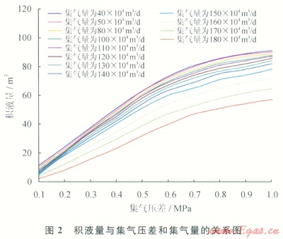 根據(jù)上述積液量計算理論,分析西干線不同集氣量下的流型、沿程的流體壓力、溫度、持液率、流速、凝析液量等的變化規(guī)律,計算給定運行工況下管線的積液量,根據(jù)西干線最大積液量、清管數(shù)據(jù)和實際生產(chǎn)數(shù)據(jù)進行模擬修正,得到西干線不同壓差和集氣量下的管線積液量的關(guān)系(圖2)。