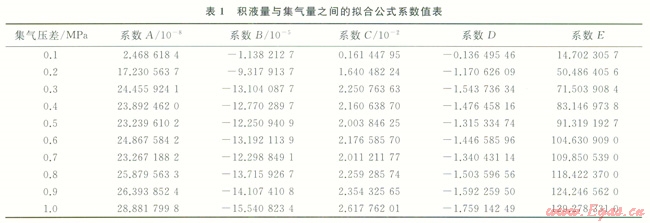 由圖2可見,給定集氣量下,集氣壓差越大,積液量越大,在相同集氣壓差下,集氣量越大,積液量越小,因為輸氣量越大,摩擦損失越大,由積液導(dǎo)致的壓損越小,根據(jù)模擬分析,擬合出積液量與集氣量和集氣壓差之間的關(guān)系式。