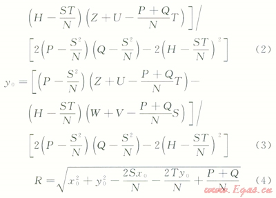 式中x0為某個下凹段管線圓心在x軸坐標(biāo)值,m;xi為某個下凹段管線第i個離散點在x軸坐標(biāo)值,m;y0為某個下凹段管線圓心在y軸坐標(biāo)值,m;yi為某個下凹段管線第i個離散點在y軸坐標(biāo)值,m。