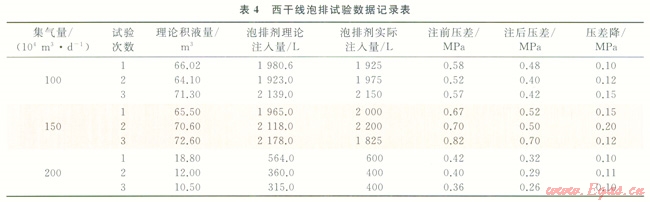 在西干線100×104m3/d、150×104m3/d、200×104m3/d不同氣量下進行現(xiàn)場試驗,在一周期試驗結(jié)束壓差下降后,持續(xù)生產(chǎn)一段時間管線進出口壓差回升時,繼續(xù)注入泡排劑,如此反得周期性注入,探索泡排劑作用周期,形成給定氣量下的泡排劑加注制度。試驗前,利用上述管道積液量計算理論計算西干線給定氣量、壓差下積液量,根據(jù)泡排劑室內(nèi)實驗的加注深度,計算出的理論注入量,實驗參數(shù)及結(jié)果見表4.