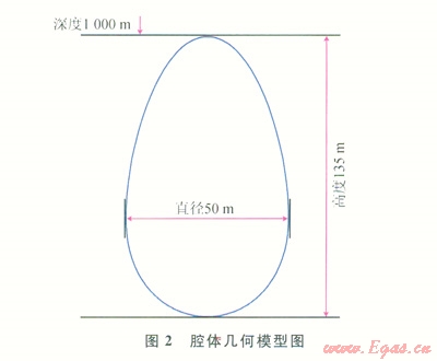 我國(guó)鹽巖礦藏以多夾層鹽巖為主,由于主要分析鹽穴儲(chǔ)氣庫(kù)溶腔在鹽巖蠕變下的變形規(guī)律,因此在建立儲(chǔ)氣庫(kù)溶腔模型時(shí)將復(fù)雜的鹽巖夾層簡(jiǎn)化為簡(jiǎn)單的單層鹽巖層。借鑒江蘇金壇鹽穴儲(chǔ)氣庫(kù)的建庫(kù)參數(shù)[4],建立了如圖2所示的腔體幾何模型。建立溶腔及圍巖地層模型后,將地層巖石力學(xué)參數(shù)、鹽層的蠕變關(guān)系、溶腔周圍的地應(yīng)力參數(shù)及溶腔運(yùn)行參數(shù)帶入模型中進(jìn)行模擬計(jì)算。