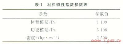 圖3中,1/4圓柱體模擬儲(chǔ)氣庫(kù)溶腔周圍的地質(zhì)環(huán)境,其直徑是儲(chǔ)氣庫(kù)溶腔模型最大直徑的20倍,在網(wǎng)格中間位置可以看到儲(chǔ)氣庫(kù)溶腔輪廓的1/4。在網(wǎng)格劃分時(shí)將儲(chǔ)氣庫(kù)溶腔網(wǎng)格一起劃分,有助于儲(chǔ)氣庫(kù)溶腔的形成。在此網(wǎng)格中,定義了2個(gè)組,分別是group1和group2,前者對(duì)儲(chǔ)氣庫(kù)溶腔進(jìn)行網(wǎng)格劃分,后者對(duì)儲(chǔ)氣庫(kù)溶腔周圍地質(zhì)環(huán)境進(jìn)行網(wǎng)格劃分。選擇采用各向同性彈性模型,其材料特性常數(shù)見表1。