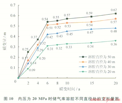 對(duì)比分析圖9~11,可以得出:①溶腔不同直徑處變形量隨時(shí)間變化規(guī)律比較一致,溶腔直徑為50m處的變形量最大;②蠕變時(shí)間為6a時(shí),不同壓力下溶腔不同直徑處變形量曲線均出現(xiàn)一個(gè)明顯的轉(zhuǎn)折點(diǎn)。蠕變時(shí)間小于6a時(shí),溶腔變形量曲線斜率較大,表明在此時(shí)間內(nèi)溶腔變形速率較大,變形比較顯著;蠕變時(shí)間大于6a時(shí),溶腔變形量曲線較平緩,溶腔變形量隨時(shí)間變化不大;③內(nèi)壓為10MPa時(shí),蠕變20a后,溶腔直徑為50m處變形量為360mm。內(nèi)壓為20MPa時(shí),蠕變20a后,溶腔直徑為50m處變形量為620mm。內(nèi)壓為30MPa時(shí),蠕變20a后,溶腔直徑為50m處變形量為640mm。數(shù)據(jù)表明,溶腔內(nèi)壓小于20MPa時(shí),溶腔變形量隨壓力增大顯著增加;溶腔內(nèi)壓大于20MPa時(shí),溶腔變形量變化不大。