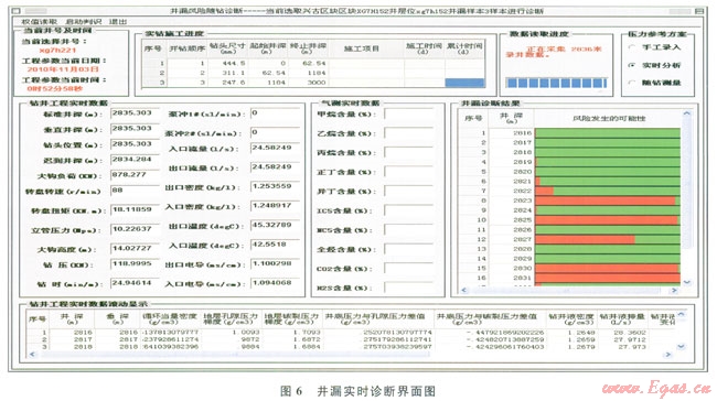 在我國某油田鉆井時(shí),應(yīng)用鉆井風(fēng)險(xiǎn)控制系統(tǒng)實(shí)時(shí)診斷鉆井狀態(tài),分別對(duì)鉆井實(shí)時(shí)數(shù)據(jù)采集軟件、鉆井實(shí)時(shí)數(shù)據(jù)庫管理軟件、鉆井風(fēng)險(xiǎn)因素實(shí)時(shí)計(jì)算分析軟件和鉆井風(fēng)險(xiǎn)推理風(fēng)險(xiǎn)軟件進(jìn)行現(xiàn)場測試(圖5、6)。以采集的鉆井實(shí)時(shí)數(shù)據(jù)為基礎(chǔ),應(yīng)用鉆井風(fēng)險(xiǎn)因素實(shí)時(shí)分析軟件計(jì)算井底壓力和地層壓力等參數(shù),以鄰井資料作為井漏風(fēng)險(xiǎn)學(xué)習(xí)的樣本,判斷該井井漏風(fēng)險(xiǎn),系統(tǒng)判斷該井在鉆至2823m時(shí)井漏風(fēng)險(xiǎn)可能性較大,當(dāng)鉆進(jìn)至2825m時(shí)技術(shù)人員發(fā)現(xiàn)井底發(fā)生漏失,決定進(jìn)行起鉆堵漏作業(yè)。現(xiàn)場測試表明鉆井風(fēng)險(xiǎn)控制系統(tǒng)的數(shù)據(jù)采集軟件與儀器測量儀器同步性好,數(shù)據(jù)庫設(shè)計(jì)合理,且井漏風(fēng)險(xiǎn)實(shí)時(shí)診斷預(yù)測結(jié)果與現(xiàn)場完全吻合。