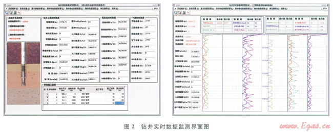 3)建立了以國際通用WITS標(biāo)準(zhǔn)為參考依據(jù)的鉆井風(fēng)險(xiǎn)控制系統(tǒng)數(shù)據(jù)庫,并優(yōu)化了數(shù)據(jù)庫結(jié)構(gòu)及查詢模式,開發(fā)了鉆井風(fēng)險(xiǎn)控制系統(tǒng)實(shí)時(shí)數(shù)據(jù)庫管理軟件。軟件為用戶提供了數(shù)據(jù)庫備份、數(shù)據(jù)庫還原功能;可以瀏覽、修改、查詢、導(dǎo)出、導(dǎo)入、刪除、整理任意井的鉆井?dāng)?shù)據(jù);可以對(duì)各種數(shù)據(jù)進(jìn)行實(shí)時(shí)顯示、按時(shí)間回放、按井深回放;可以將任意數(shù)據(jù)導(dǎo)出到文本文件中;可以進(jìn)行異地備份;可以按用戶需要導(dǎo)入相關(guān)數(shù)據(jù),鉆井實(shí)時(shí)數(shù)據(jù)監(jiān)測界面如圖2所示。