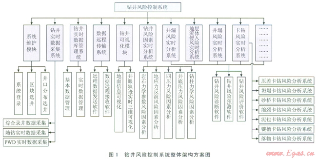 通過調(diào)研國內(nèi)外研究現(xiàn)狀,結(jié)合國內(nèi)生產(chǎn)需要,提出了一套鉆井風(fēng)險(xiǎn)控制系統(tǒng)的整體架構(gòu)方案,如圖1所示。系統(tǒng)主要包括系統(tǒng)維護(hù)模塊、實(shí)時(shí)數(shù)據(jù)采集子系統(tǒng)、實(shí)時(shí)數(shù)據(jù)庫管理子系統(tǒng)、實(shí)時(shí)數(shù)據(jù)遠(yuǎn)程傳輸子系統(tǒng)、鉆井可視化模塊、鉆井風(fēng)險(xiǎn)因素實(shí)時(shí)分析子系統(tǒng)、不同井下復(fù)雜類型實(shí)時(shí)分析子系統(tǒng)等。實(shí)時(shí)數(shù)據(jù)采集子系統(tǒng)在井場采集錄井儀和隨鉆工具等儀器測量的鉆井實(shí)時(shí)參數(shù),并存儲(chǔ)到數(shù)據(jù)庫中,供鉆井風(fēng)險(xiǎn)控制軟件系統(tǒng)調(diào)用、瀏覽、分析各項(xiàng)參數(shù)變化,并診斷、預(yù)測各種井下復(fù)雜情況,達(dá)到鉆井風(fēng)險(xiǎn)控制的目的。鉆井風(fēng)險(xiǎn)控制系統(tǒng)預(yù)期應(yīng)實(shí)現(xiàn)的功能包括: