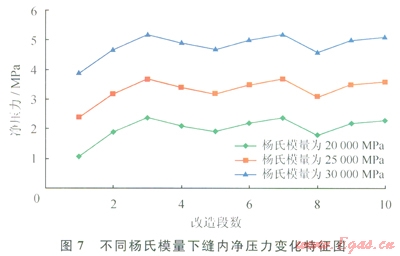 為進一步研究儲層巖石力學參數(shù)對應(yīng)力陰影的影響,設(shè)置不同泊松比和楊氏模量進行研究??疾觳此?span lang="EN-US">0.2、0.35、0.45比時,結(jié)果表明泊松比對應(yīng)力陰影的影響較小,即便在泊松比為0.5的極端情況下,導致的凈壓力變化幅度仍不大,因此產(chǎn)生的應(yīng)力影響很小(圖6)??疾鞐钍夏A?span lang="EN-US">20000MPa、25000MPa、30000MPa等3種情況,研究表明:楊氏模量對裂縫內(nèi)凈壓力值的變化影響較大,產(chǎn)生的應(yīng)力陰影現(xiàn)象越強烈,楊氏模量越高對裂縫應(yīng)力陰影效果影響也較大(圖7)。因此,儲層巖石力學參數(shù)中楊氏模量對應(yīng)力陰影現(xiàn)象的影響最敏感。