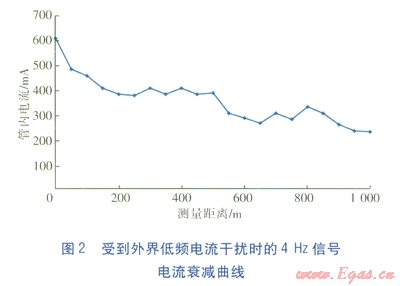 一般情況下,管道內(nèi)的信號(hào)電流應(yīng)該隨著測(cè)量距離的增大而不斷衰減,但是當(dāng)存在外界低頻電流干擾時(shí),4Hz的信號(hào)電流會(huì)出現(xiàn)突然反彈或者波動(dòng)的現(xiàn)象,受到外界低頻電流干擾時(shí)的4Hz信號(hào)電流衰減曲線(xiàn)見(jiàn)圖2[6]。外界干擾的低頻電流會(huì)與檢測(cè)中使用的4Hz低頻信號(hào)電流互相作用,產(chǎn)生疊加或抵消,當(dāng)疊加時(shí),會(huì)出現(xiàn)圖2中信號(hào)電流反彈升高的情況;當(dāng)?shù)窒麜r(shí),會(huì)出現(xiàn)信號(hào)電流驟然變小的情況。無(wú)論是疊加還是抵消,都會(huì)對(duì)防腐層的檢測(cè)結(jié)果產(chǎn)生很大影響,甚至嚴(yán)重失真。