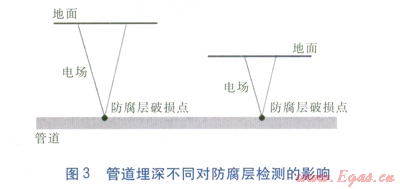 一般地,城鎮(zhèn)燃?xì)夤艿栏魈幝裆畈煌2煌墓艿缆裆顚?huì)對(duì)防腐層破損點(diǎn)處泄漏電流產(chǎn)生的電場(chǎng)產(chǎn)生很大影響。假設(shè)管道防腐層的破損情況相同、周?chē)寥离娮杪首兓淮螅?dāng)管道埋深較小時(shí),從防腐層破損點(diǎn)向外傳導(dǎo)的電流相對(duì)集中,在地面上檢測(cè)到的電流較大;而當(dāng)管道埋深較大時(shí),在地面上檢測(cè)到的電流較小(見(jiàn)圖3)。