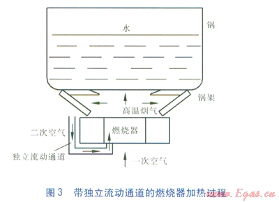 為提高火焰溫度,降低過??諝庀禂?shù),改善二次空氣補(bǔ)充狀況,在燃燒器引射能力較好、一次空氣系數(shù)較大的情況下,主要考慮二次空氣補(bǔ)充的區(qū)域設(shè)計。二次空氣入口面積受布置空間、火焰狀態(tài)、煙氣中CO含量等因素的限制,燃燒器結(jié)構(gòu)較難做出大的改善。為了減少高溫?zé)煔馀c二次空氣流動的互相干擾,我們采取了將高溫?zé)煔馀c二次空氣互相隔離、形成獨立流動通道的創(chuàng)新方法,設(shè)計一個結(jié)構(gòu)件作為二次空氣的獨立流動通道。帶獨立流動通道的燃燒器加熱過程見圖3。高溫?zé)煔馀c二次空氣通過一個特殊的爐架分隔,高溫?zé)煔鈴臓t架上方排出,二次空氣從爐架下方吸入,經(jīng)過獨立流動通道補(bǔ)充至燃燒器。