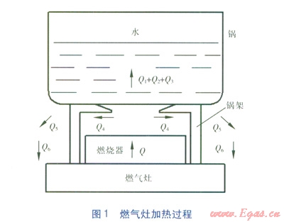 家用燃?xì)庠顭嵝适窃跇?biāo)準(zhǔn)試驗條件下,有效利用的熱量在燃?xì)馊紵尫趴偀崃恐兴嫉谋壤?,即燃?xì)饽茉吹睦寐?,是衡量家用燃?xì)庠钍欠窆?jié)能的關(guān)鍵指標(biāo)。我們以GB16410—2007《家用燃?xì)庠罹摺芬?guī)定的標(biāo)準(zhǔn)試驗條件下的燃?xì)庠詈驮囼炗缅佔鳛檠芯繉ο?,分析燃?xì)庠畹募訜徇^程(見圖1)。