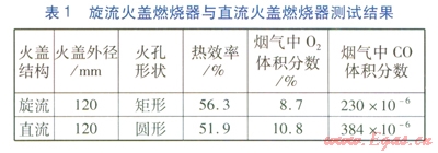 經(jīng)過整機(jī)測試,與傳統(tǒng)的直流火蓋燃燒器對比,旋流火蓋燃燒器比傳統(tǒng)直流火蓋燃燒器燃燒更均勻穩(wěn)定,熱效率高4%(絕對值)以上,煙氣中CO含量更低。測試結(jié)果見表1。