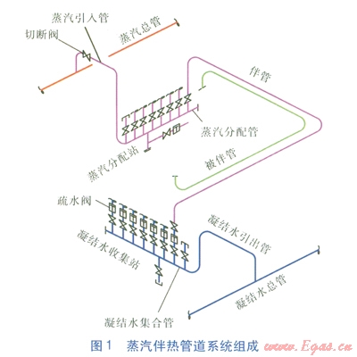 蒸汽伴熱系統(tǒng)組成見圖1,主要包括:蒸汽總管,蒸汽引入管,蒸汽分配站,伴管,被伴管,凝結(jié)水收集站,凝結(jié)水引出管,凝結(jié)水總管等[3]。