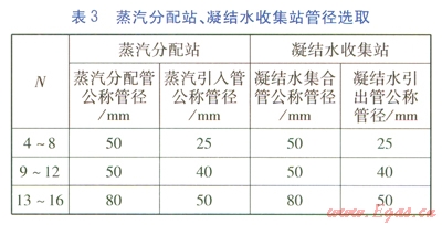 《規(guī)范》規(guī)定,先計算蒸汽分配站、凝結(jié)水收集站各種管徑伴管總根數(shù)(應(yīng)包括備用接頭管徑對應(yīng)的根數(shù))N,然后根據(jù)表3選取蒸汽分配管、蒸汽引入管、凝結(jié)水集合管、凝結(jié)水引出管公稱直徑。當(dāng)N超過16時,宜設(shè)立兩座或兩座以上蒸汽分配站、凝結(jié)水收集站。N的計算式為: