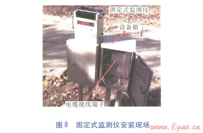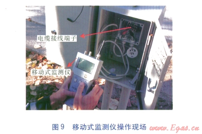 固定式監(jiān)測(cè)儀由220V電源供電,最大監(jiān)測(cè)管段長(zhǎng)度為5km,對(duì)于長(zhǎng)距離熱網(wǎng),應(yīng)根據(jù)監(jiān)測(cè)儀的最大監(jiān)測(cè)管段長(zhǎng)度,將熱網(wǎng)分為若干獨(dú)立的監(jiān)測(cè)回路。固定式監(jiān)測(cè)儀置于專(zhuān)門(mén)設(shè)備箱內(nèi),故障信號(hào)可上傳至監(jiān)測(cè)中心,實(shí)施遠(yuǎn)距離監(jiān)測(cè)系統(tǒng)集中管理。移動(dòng)式監(jiān)測(cè)儀能夠?qū)?span lang="EN-US">2~5km長(zhǎng)度范圍內(nèi)的管段進(jìn)行監(jiān)測(cè),可實(shí)現(xiàn)對(duì)附近沒(méi)有電源無(wú)法設(shè)置固定式監(jiān)測(cè)儀及某些分支管段的監(jiān)測(cè)。固定式監(jiān)測(cè)儀安裝現(xiàn)場(chǎng)、移動(dòng)式監(jiān)測(cè)儀操作現(xiàn)場(chǎng)分別見(jiàn)圖8、9。