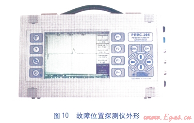 故障位置探測(cè)儀主要用于確定故障位置,一旦監(jiān)測(cè)中心接到報(bào)警信息,并確定報(bào)警固定式監(jiān)測(cè)儀具體位置,或由移動(dòng)式監(jiān)測(cè)儀監(jiān)測(cè)出故障管段。操作人員攜帶故障位置探測(cè)儀,對(duì)故障管段進(jìn)行故障點(diǎn)定位。故障位置探測(cè)儀的監(jiān)測(cè)管段長(zhǎng)度為2~10km,與電纜接線端子的接入方法與移動(dòng)式監(jiān)測(cè)儀相同,設(shè)備外形見(jiàn)圖10。