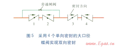 經(jīng)研究,如圖5所示采用4個(gè)單向密封的大口徑蝶閥,達(dá)到雙向密封的目的,而且采取保護(hù)措施,可以使大口徑蝶閥長期處于良好工作狀態(tài)。