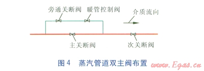 在可能的情況下,蒸汽管道暖管啟動后,盡可能待管道閥后蒸汽壓力達(dá)到閥前壓力時(shí)再開啟大口徑主閥,這樣可以保證大口徑閥門開啟過程中前后無壓差,大口徑閥門的密封面可得到有效的保護(hù)。如果蒸汽壓力較高(1.0MPa或以上)且無法做到利用旁通閥使閥后壓力達(dá)到或接近閥前壓力時(shí)開啟主閥,為保護(hù)大口徑主閥的密封面,可采取雙主閥的布置方法(見圖4)。