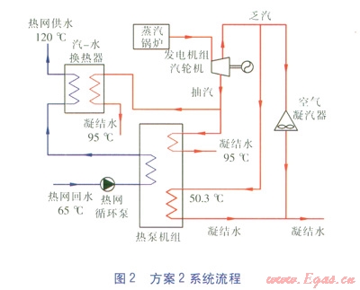 發(fā)電機(jī)組汽輪機(jī)抽汽作為熱泵機(jī)組驅(qū)動(dòng)蒸汽,低溫?zé)嵩礊樾∑啓C(jī)凝汽器冷卻水余熱。方案1的系統(tǒng)流程見(jiàn)圖1。系統(tǒng)流程可分為3個(gè)分項(xiàng)流程:a.熱網(wǎng)循環(huán)水流程:熱網(wǎng)回水65℃,經(jīng)熱泵機(jī)組加熱至88℃后,進(jìn)入汽—水換熱器加熱至l20℃作為熱網(wǎng)供水。b.發(fā)電機(jī)組汽輪機(jī)抽汽流程:不考慮小汽輪機(jī)用汽,發(fā)電機(jī)組汽輪機(jī)抽汽分為兩部分,一部分作為熱泵機(jī)組驅(qū)動(dòng)蒸汽,另一部分進(jìn)入汽—水換熱器加熱熱網(wǎng)回水,兩部分凝結(jié)水溫度均為95℃,并由汽動(dòng)給水泵加壓輸送回蒸汽鍋爐。c.凝汽器冷卻水流程:小汽輪機(jī)凝汽器出口冷卻水溫度為51℃,作為熱泵機(jī)組低溫?zé)嵩?,余熱利用后溫度降?span lang="EN-US">42.7℃,經(jīng)冷卻塔進(jìn)一步降溫后(冷卻塔出水溫度為37.5℃)進(jìn)入凝汽器。