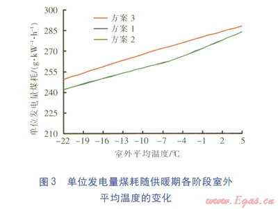 供暖期按180d計(jì)算,供熱系統(tǒng)采用分階段改變流量的質(zhì)調(diào)節(jié)方式。單位發(fā)電量煤耗(發(fā)電煤耗為總煤耗扣除發(fā)電機(jī)組汽輪機(jī)抽汽熱量折算煤耗、熱泵機(jī)組回收的小汽輪機(jī)排汽余熱折算煤耗、發(fā)電機(jī)組汽輪機(jī)乏汽余熱折算煤耗)隨供暖期各階段室外平均溫度的變化見(jiàn)圖3。由圖3可知,由于方案1、2利用了工藝余熱,單位發(fā)電量煤耗明顯小于方案3。方案1、2的單位發(fā)電量煤耗非常接近,由于乏汽余熱品質(zhì)略高于小汽輪機(jī)凝汽器冷卻水,因此方案2的單位發(fā)電量煤耗略低于方案1。