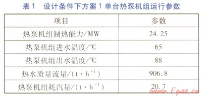 方案1的運(yùn)行策略為:初末寒期采用熱泵機(jī)組單獨(dú)供熱,汽—水換熱器不啟動(dòng),當(dāng)熱泵機(jī)組出水溫度不能滿足要求時(shí),啟動(dòng)汽—水換熱器對(duì)熱泵機(jī)組出水進(jìn)行加熱。配置4臺(tái)制熱能力為24.25MW的熱泵機(jī)組,3臺(tái)換熱能力為45MW的汽—水換熱器。設(shè)計(jì)條件下(室外溫度為-22℃),方案1單臺(tái)熱泵機(jī)組運(yùn)行參數(shù)見(jiàn)表1。