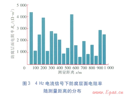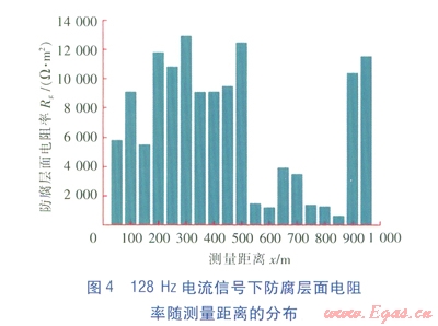 從圖3、4的測(cè)量結(jié)果來(lái)看,4Hz電流信號(hào)測(cè)量的結(jié)果,防腐層的質(zhì)量較差,平均面電阻率為2106W·m2;128Hz電流信號(hào)測(cè)量的結(jié)果,防腐層的平均面電阻率為6926W·m2。
