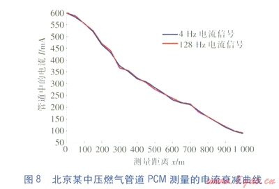 從圖8可以看出,在野外環(huán)境中,受到干擾較小,4Hz和128Hz的電流衰減曲線基本一致,沒(méi)有出現(xiàn)較大波動(dòng)的情況。利用評(píng)估軟件對(duì)燃?xì)夤艿赖姆栏瘜用骐娮杪蔬M(jìn)行計(jì)算,4Hz電流信號(hào)的防腐層平均面電阻率的計(jì)算結(jié)果為8264W·m2;128Hz電流信號(hào)的防腐層面電阻率的計(jì)算結(jié)果為8697W·m2。對(duì)照組的實(shí)驗(yàn)結(jié)果表明,在干擾較小的情況下,4Hz電流信號(hào)和128Hz電流信號(hào)的檢測(cè)結(jié)果差異不大。