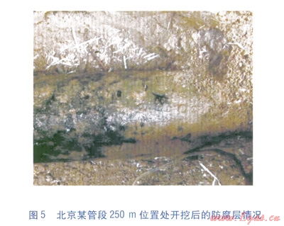 為了進(jìn)一步對(duì)檢測(cè)結(jié)果的準(zhǔn)確性進(jìn)行判斷和分析,這里采用了開挖驗(yàn)證的方式。在4Hz電流信號(hào)測(cè)量結(jié)果中(見圖3),在距離起點(diǎn)約250m處附近出現(xiàn)了防腐層的面電阻率較低的現(xiàn)象,而l28Hz電流信號(hào)檢測(cè)的結(jié)果表明該處防腐層的質(zhì)量相對(duì)較好(見圖4)。結(jié)合ACVG對(duì)防腐層質(zhì)量較差的位置進(jìn)行定位和開挖驗(yàn)證,該處開挖坑內(nèi)防腐層的情況見圖5。