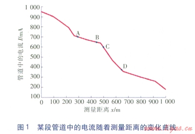 實(shí)際管道中的電流隨著測(cè)量距離變化的一般規(guī)律為:電流隨距離的增加而衰減,在管徑、管材、土壤環(huán)境不變的情況下,防腐層的絕緣性越好,電流損失越少,衰減亦越??;反之,若防腐層損壞,如老化、變質(zhì)、脫落等,絕緣性能越差,電流損失越嚴(yán)重,衰減也就越大。某段實(shí)際管道中的電流隨著測(cè)量距離的變化曲線見圖1。