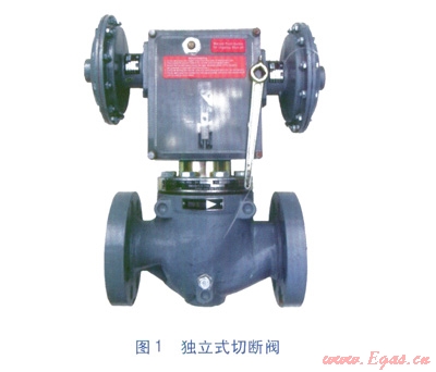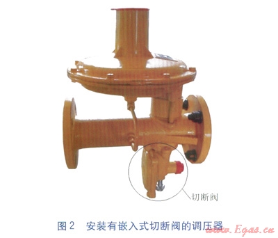 城鎮(zhèn)燃氣自力式切斷閥根據(jù)組裝方式不同,主要分為兩大類:一種是作為獨立的切斷裝置,安裝于調(diào)壓器之前,稱為獨立式切斷閥,見圖1;另外一種是集成于調(diào)壓器上,作為調(diào)壓器的輔助構(gòu)件之一,稱為嵌入式切斷閥,見圖2。