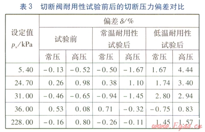 表3是5組不同廠家、不同型號切斷閥常溫耐用性試驗和低溫耐用性試驗(低溫試驗條件為-20℃)前后的實際切斷壓力與切斷壓力設(shè)定值的偏差對比。