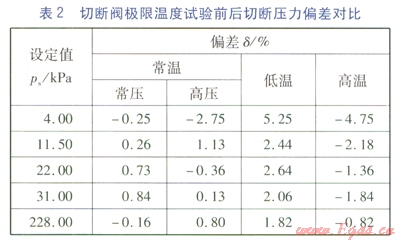 ④極限溫度條件會導(dǎo)致切斷閥的實際切斷壓力值與切斷壓力設(shè)定值之間產(chǎn)生一定的偏差,且比常溫條件下的偏差更大。因此廠家在進行產(chǎn)品研發(fā)時,要充分考慮極限溫度條件對切斷閥切斷性能的影響。
