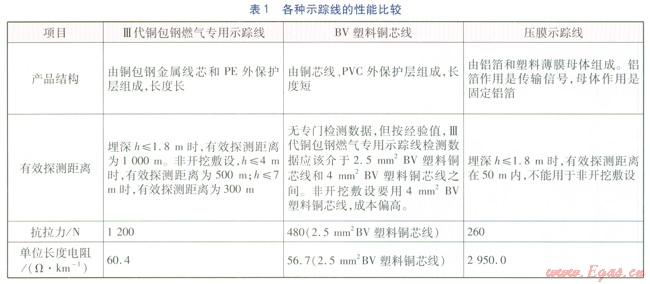 ①摒棄壓膜示蹤線之后,目前較多選用BV塑料銅芯線作為示蹤線代用產(chǎn)品,但因其是非專業(yè)產(chǎn)品,存在成本高、抗腐蝕和抗老化性能差、抗拉力有局限性、長(zhǎng)度短致使接頭增多等缺陷。筆者建議可改用Ⅲ代銅包鋼燃?xì)鈱S檬聚櫨€,兇其具有電阻小、抗拉強(qiáng)度高、抗腐蝕和抗老化性能好、長(zhǎng)度長(zhǎng)可減少接頭、連接處有專用連接防護(hù)接頭等優(yōu)勢(shì),可滿足水平定向鉆敷設(shè)PE燃?xì)夤艿缹?duì)示蹤線的要求。根據(jù)中山順康塑料制品公司提供的數(shù)據(jù),對(duì)幾種示 蹤線進(jìn)行性能比較,見表1。