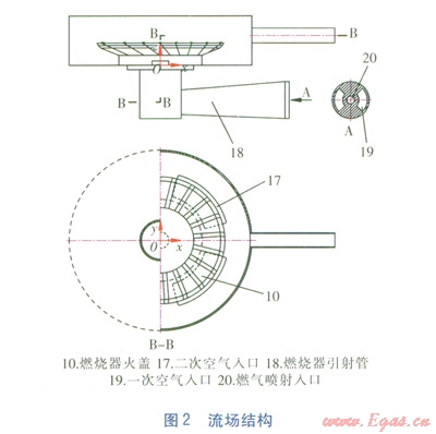 伴隨著人們生活水平的提高和國家能源結(jié)構(gòu)的調(diào)整,高效、環(huán)保、節(jié)能型烹飪灶具逐漸成為市場的寵兒[1-2]。內(nèi)燃灶就是在這樣的背景下提出來的。從基于第一代樣機所做的原理驗證性試驗來看,內(nèi)燃灶的工作原理基本可行[3]。然而,通過試驗數(shù)據(jù)計算得到的熱效率值與理論值之間有較大偏差;同時,樣機的高效率區(qū)所對應(yīng)的燃?xì)忾y開度偏離了家用燃?xì)庠畹某S霉ぷ鲄^(qū)。因此必須對樣機結(jié)構(gòu)進(jìn)行改進(jìn)。明確燃?xì)夂涂諝庠跔t腔內(nèi)的流動狀態(tài),對于發(fā)現(xiàn)樣機設(shè)計上存在的問題和改進(jìn)樣機結(jié)構(gòu)具有重要的指導(dǎo)意義。