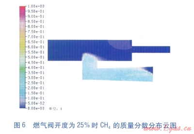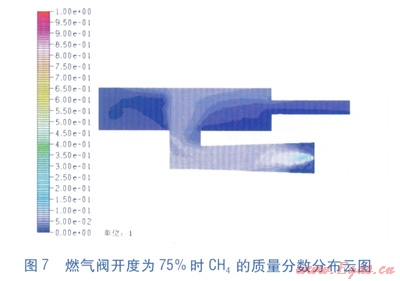 圖6、7為沿爐腔排氣導(dǎo)管軸線縱截面(即y=0平面)內(nèi)CH4的質(zhì)量分?jǐn)?shù)分布云圖,單位為l。當(dāng)燃?xì)忾y開度為25%時,燃?xì)鈬娚渌俣容^低,引射管內(nèi)CH4的質(zhì)量分?jǐn)?shù)較大,說明燃?xì)獾靡栽谝涔軆?nèi)和空氣預(yù)混充分,然后進(jìn)入爐腔內(nèi)點火燃燒。當(dāng)燃?xì)忾y開度為75%時,燃?xì)鈬娚渌俣容^高,引射管內(nèi)CH4的質(zhì)量分?jǐn)?shù)比燃?xì)忾y開度為25%狀態(tài)低了很多。