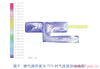 圖8、9為沿爐腔排氣導(dǎo)管軸線縱截面(y=0平面)內(nèi)氣流流動跡線圖,單位為m/s。從圖8、9中可以看出,氣體在進(jìn)入爐腔后形成旋流,有助于進(jìn)一步促進(jìn)燃?xì)夂涂諝饣旌铣浞?,提高燃燒質(zhì)量。在靠近爐腔排氣導(dǎo)管時,由于氣流流通截面突變,氣流流速迅速增大,并最終沿著排氣導(dǎo)管以較高的速度流出。當(dāng)燃?xì)忾y開度為25%時,由于進(jìn)入爐腔內(nèi)的氣體的平均流速較低,氣體的流動跡線較為清晰,燃?xì)夂涂諝膺M(jìn)一步混合后,可以較為平穩(wěn)地燃燒。而當(dāng)燃?xì)忾y開度為75%時,由于進(jìn)入爐腔內(nèi)的氣體的平均流速增大,氣流沿z軸正方向有較大的速度分量,會對爐板形成一定的沖擊,且氣體的流動跡線較為雜亂,這可能會造成燃?xì)鉄o法穩(wěn)定燃燒。